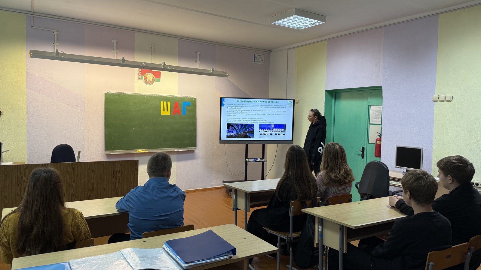23 октября в школе прошло очередное мероприятие информационно-образовательного проекта «ШАГ» — «Школа активного гражданина». В рамках темы «Быть достойным гражданином Республики Беларусь – значит чтить законы своего государства и брать на себя ответственность за будущую судьбу своей страны». Мероприятие прошло в формате диалога. В ходе встречи обсуждались такие вопросы, как Конституция Беларуси, роль Президента страны, Всебелорусское народное собрание, структура государственной власти. Большое внимание было уделено ценностным ориентирам белорусского общества. Из материалов презентации учащиеся узнали о том, как основные ветви государственной власти в Беларуси взаимодействуют между собой. С большим интересом ребята слушали информацию о государственных наградах и премиях. Поименно были перечислены граждане нашей страны, удостоенные звания «Герой Беларуси». Среди них – защитники Отечества, руководители передовых промышленных и сельскохозяйственных предприятий, финансовых учреждений, деятели культуры и спорта, митрополит, космонавт.