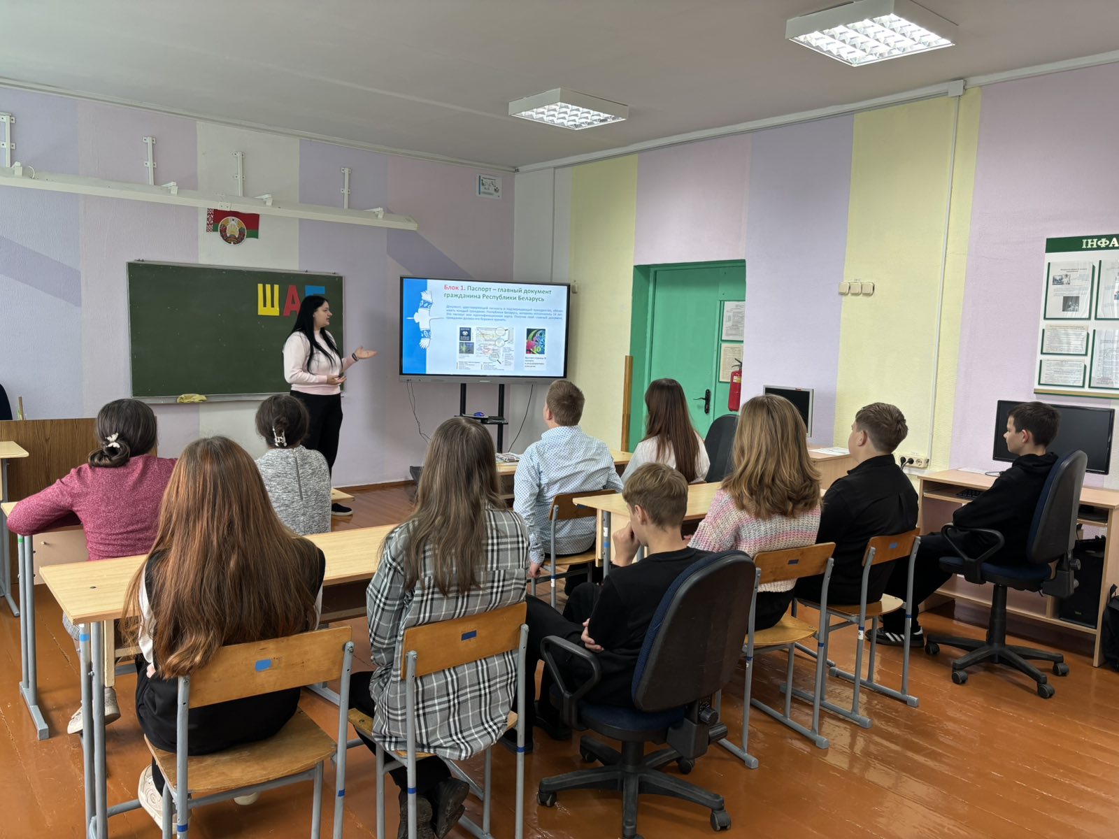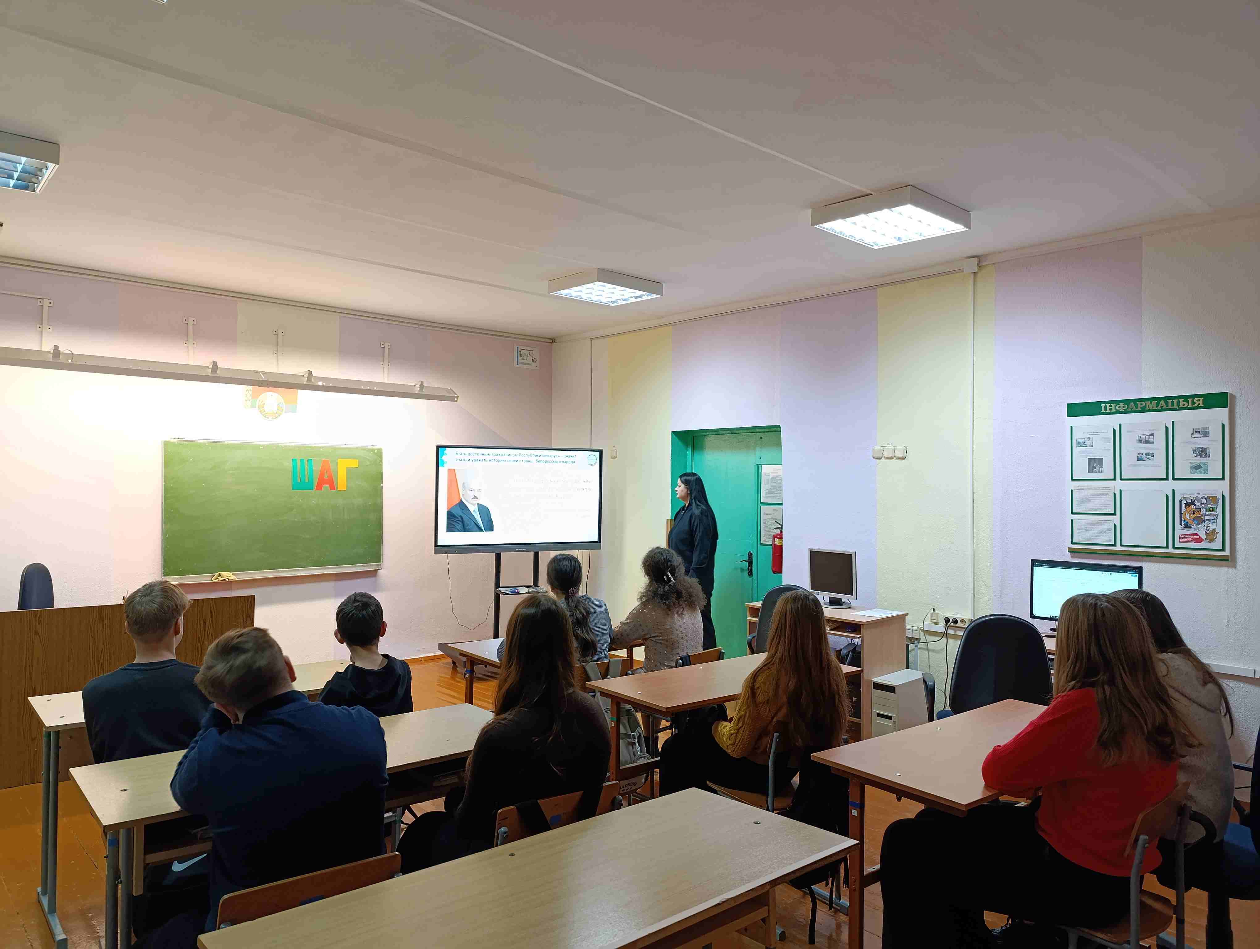 23 октября в школе прошло очередное мероприятие информационно-образовательного проекта «ШАГ» — «Школа активного гражданина». В рамках темы «Быть достойным гражданином Республики Беларусь – значит чтить законы своего государства и брать на себя ответственность за будущую судьбу своей страны». Мероприятие прошло в формате диалога. В ходе встречи обсуждались такие вопросы, как Конституция Беларуси, роль Президента страны, Всебелорусское народное собрание, структура государственной власти. Большое внимание было уделено ценностным ориентирам белорусского общества. Из материалов презентации учащиеся узнали о том, как основные ветви государственной власти в Беларуси взаимодействуют между собой. С большим интересом ребята слушали информацию о государственных наградах и премиях. Поименно были перечислены граждане нашей страны, удостоенные звания «Герой Беларуси». Среди них – защитники Отечества, руководители передовых промышленных и сельскохозяйственных предприятий, финансовых учреждений, деятели культуры и спорта, митрополит, космонавт.